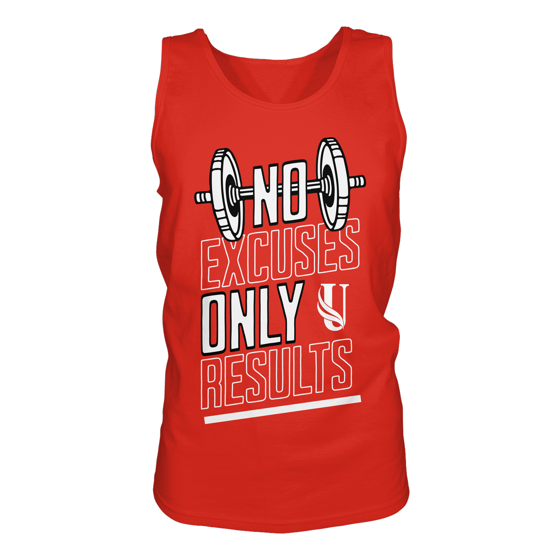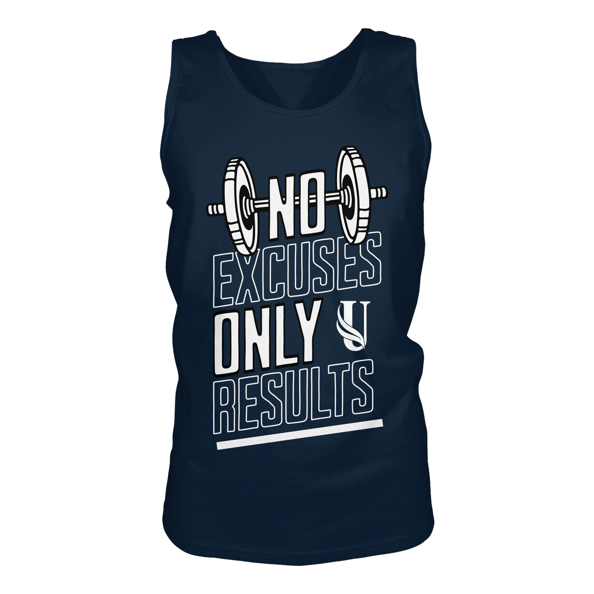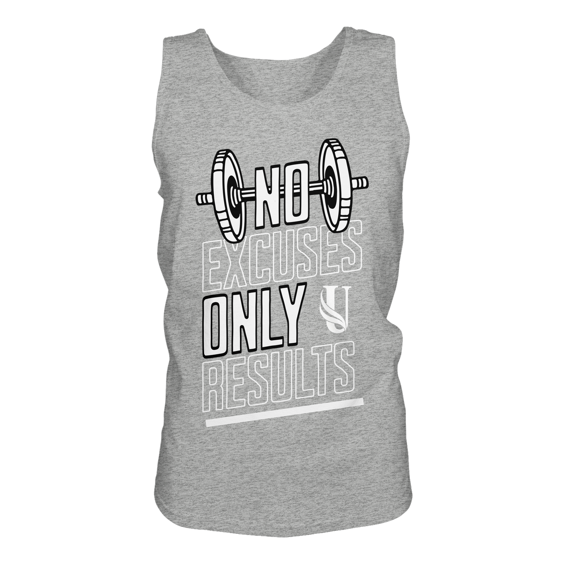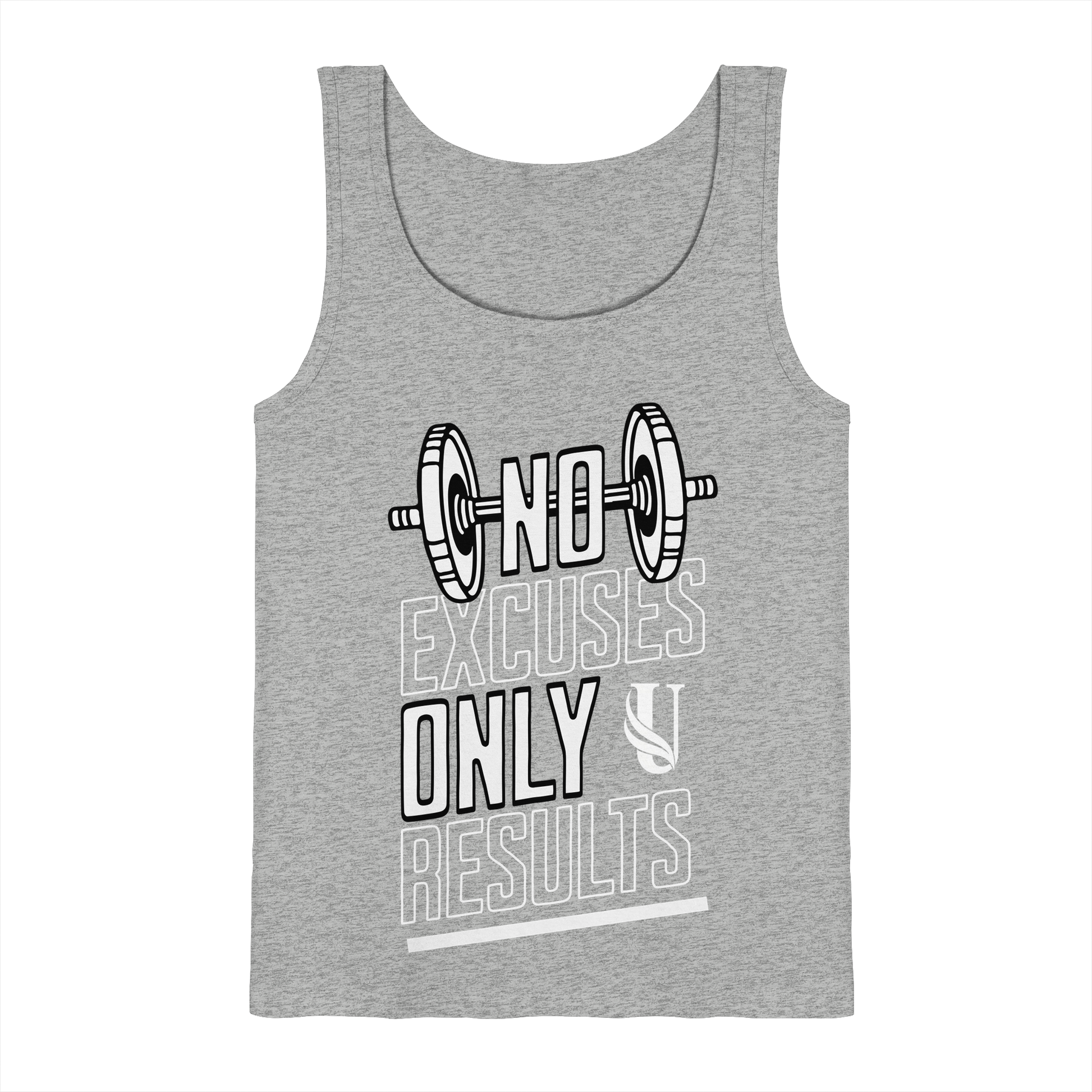 Mit dem kraftvollen Slogan "No Excuses Only Results" und einem stilisierten Hantelmotiv strahlt dieses Top Entschlossenheit aus. Die Schwarz-Weiß-Farbgebung verstärkt den Fokus und die Konzentration.